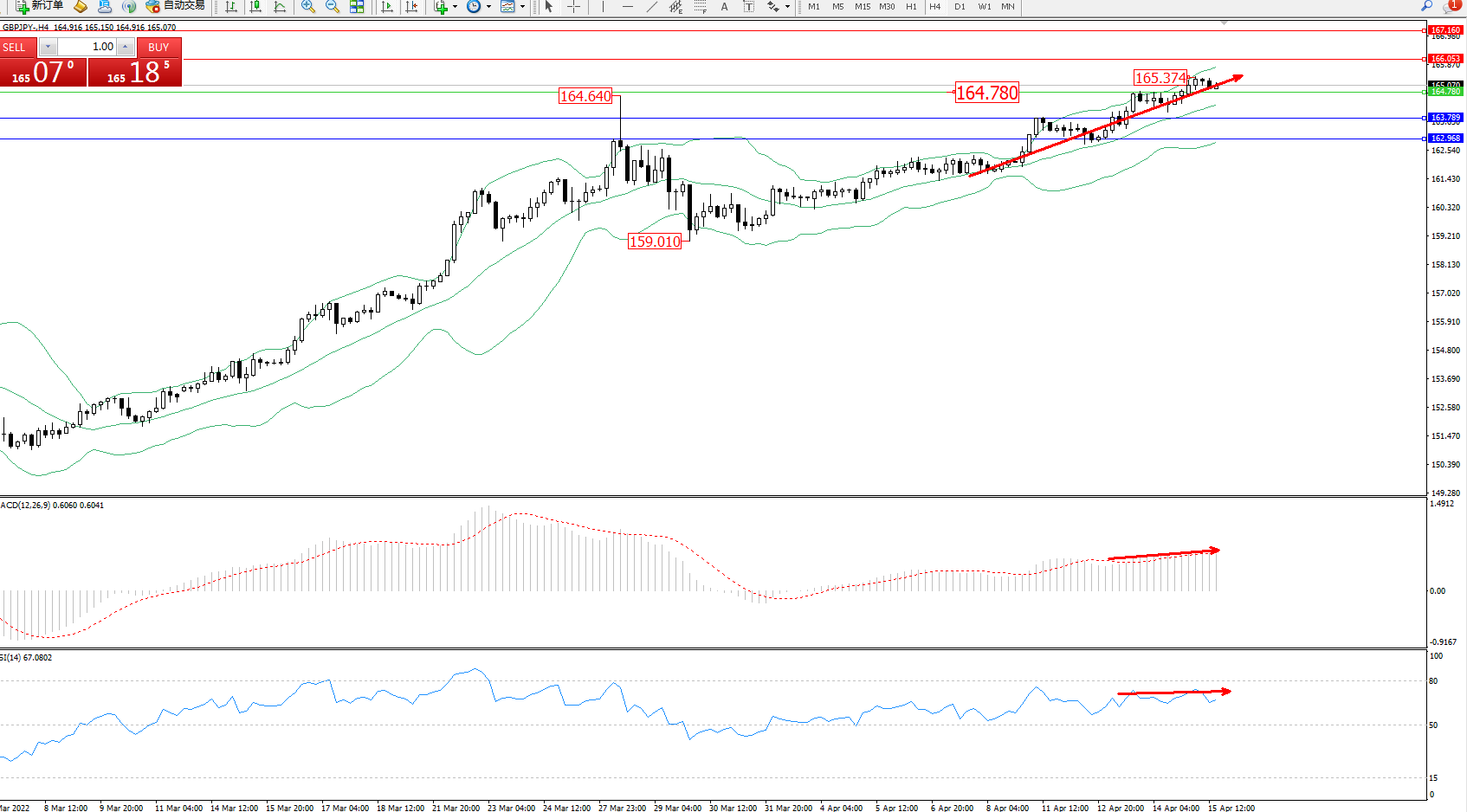 交易策略:164.780上方看涨,目标166.053、167.160