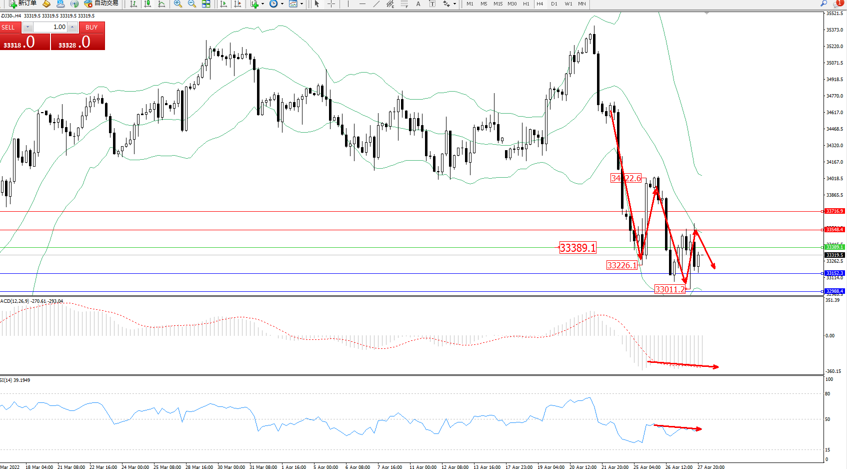 道琼斯指数DJ30——4小时K线图显示: