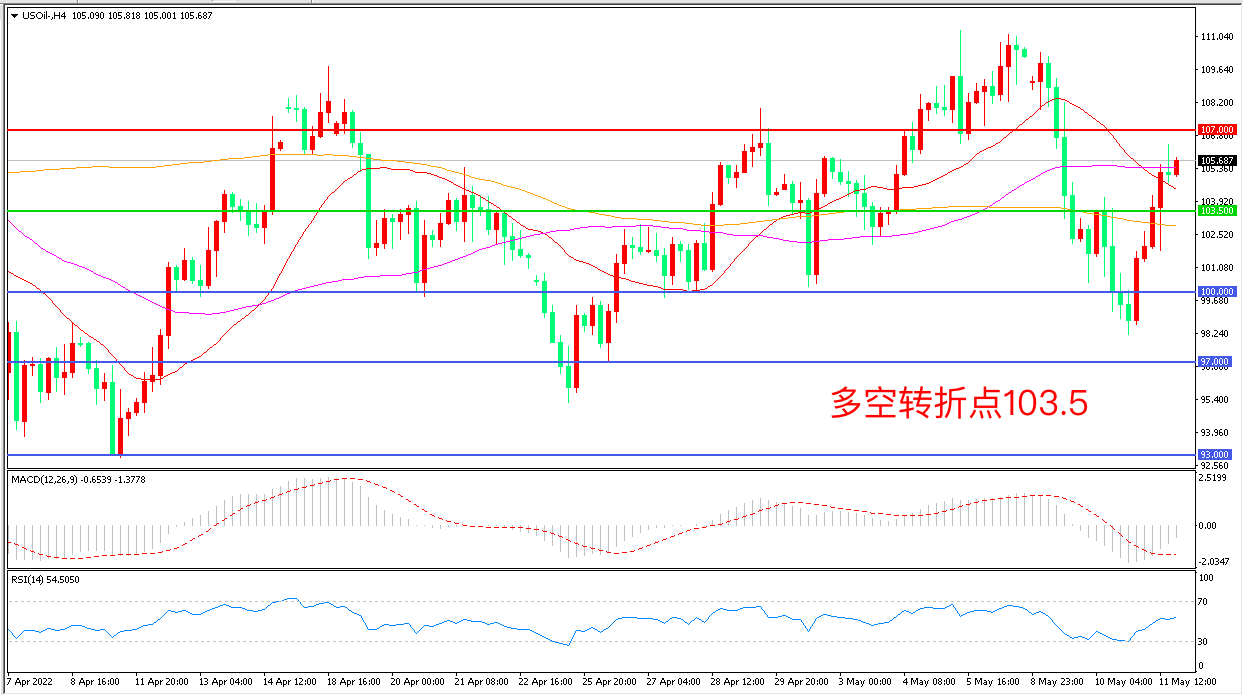 4小时图看,油价回踩100美元后连续反弹,短期走势回暖,均线系统走平,MACD绿柱缩短,RSI指标走平,日内震荡上行概率较大。