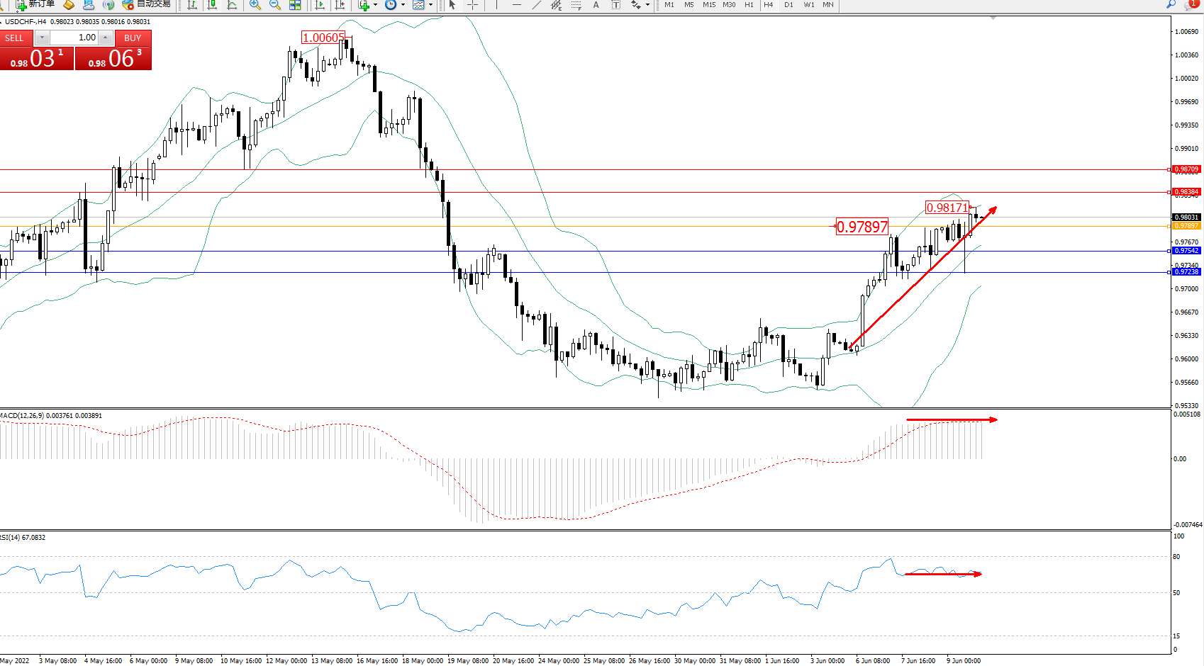 备选策略:0.97897下方看跌,目标0.97542、0.97238