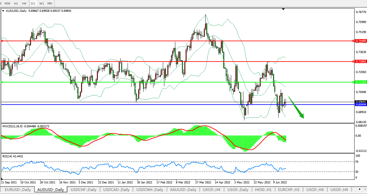 日线图看:短期汇价整理与中下轨之间,汇价宽幅整理多次试反弹无果,布林带指标呈开口走势下行中,MACD运行于0轴下方且量能开始放量,RSI迅速走弱,预计汇价大概率将在反弹后进一步下行。