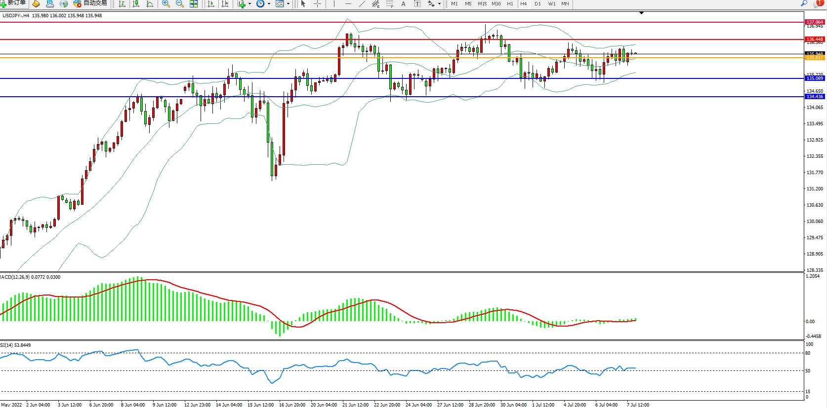 4小时图看:长时间维持在布林带指标通道内窄幅整理,布林带指标呈收口走势中,波幅空间逐渐收窄,MACD指标处于0轴线上側徘徊,RSI指标处于50均衡线上側整理中;