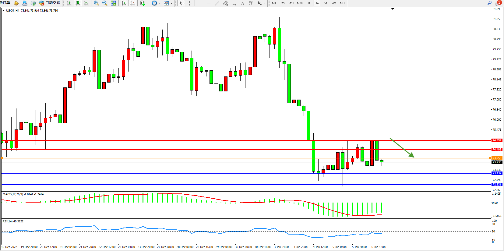 原油维持73.730附近震荡,原油市场在新的一年里“跌跌撞撞”,部分原因是日益增长的避险情绪以及对美联储更多加息将抑制需求的担忧。美国大部分地区的温和天气也是一个利空因素,因为这降低了美国东北部发电厂的天然气和石油转换量。