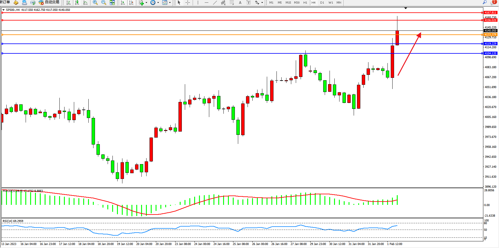 标普SP500——4小时K线图显示: