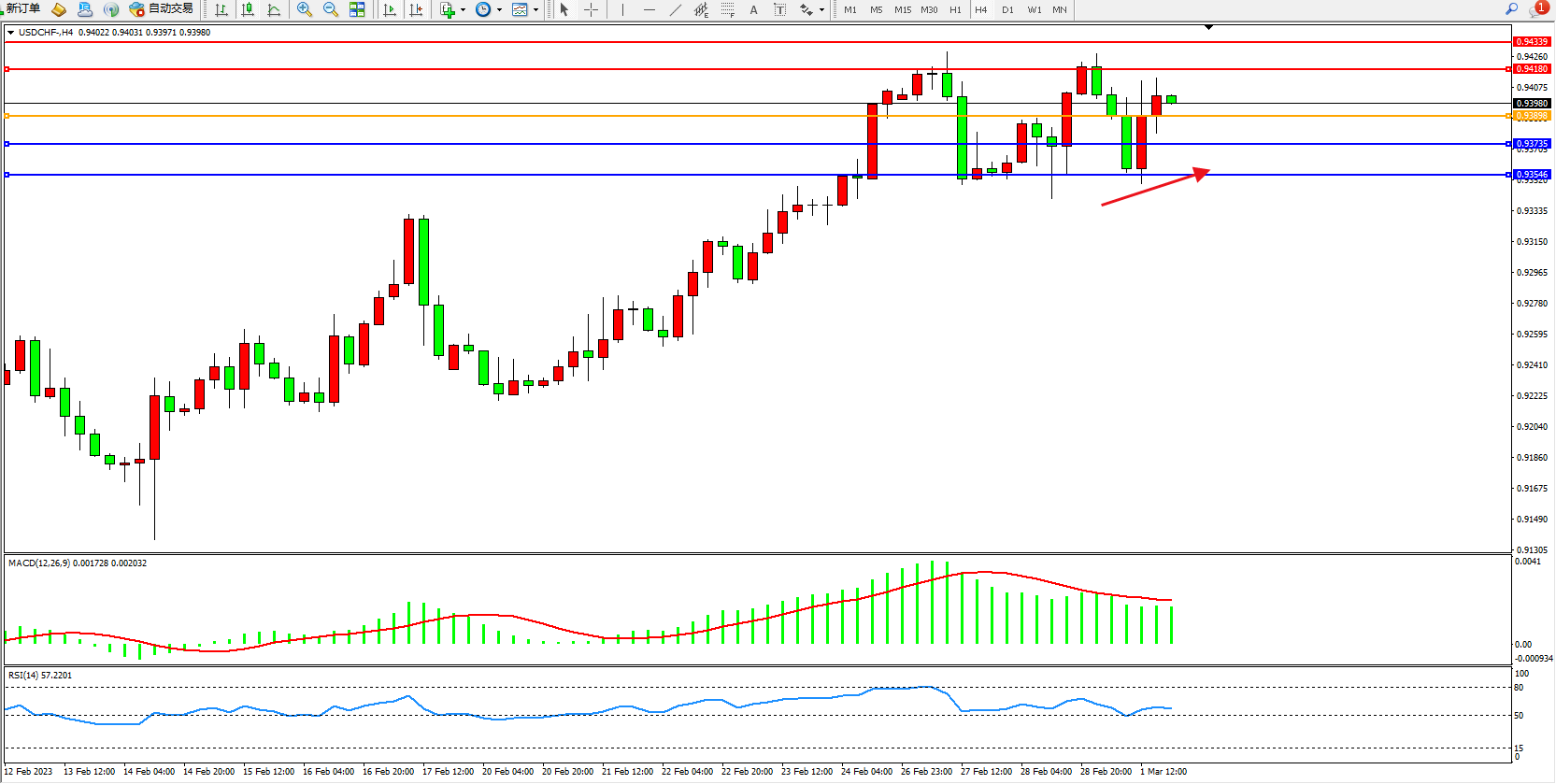 美元瑞郎USDCHF——4小时K线图显示: