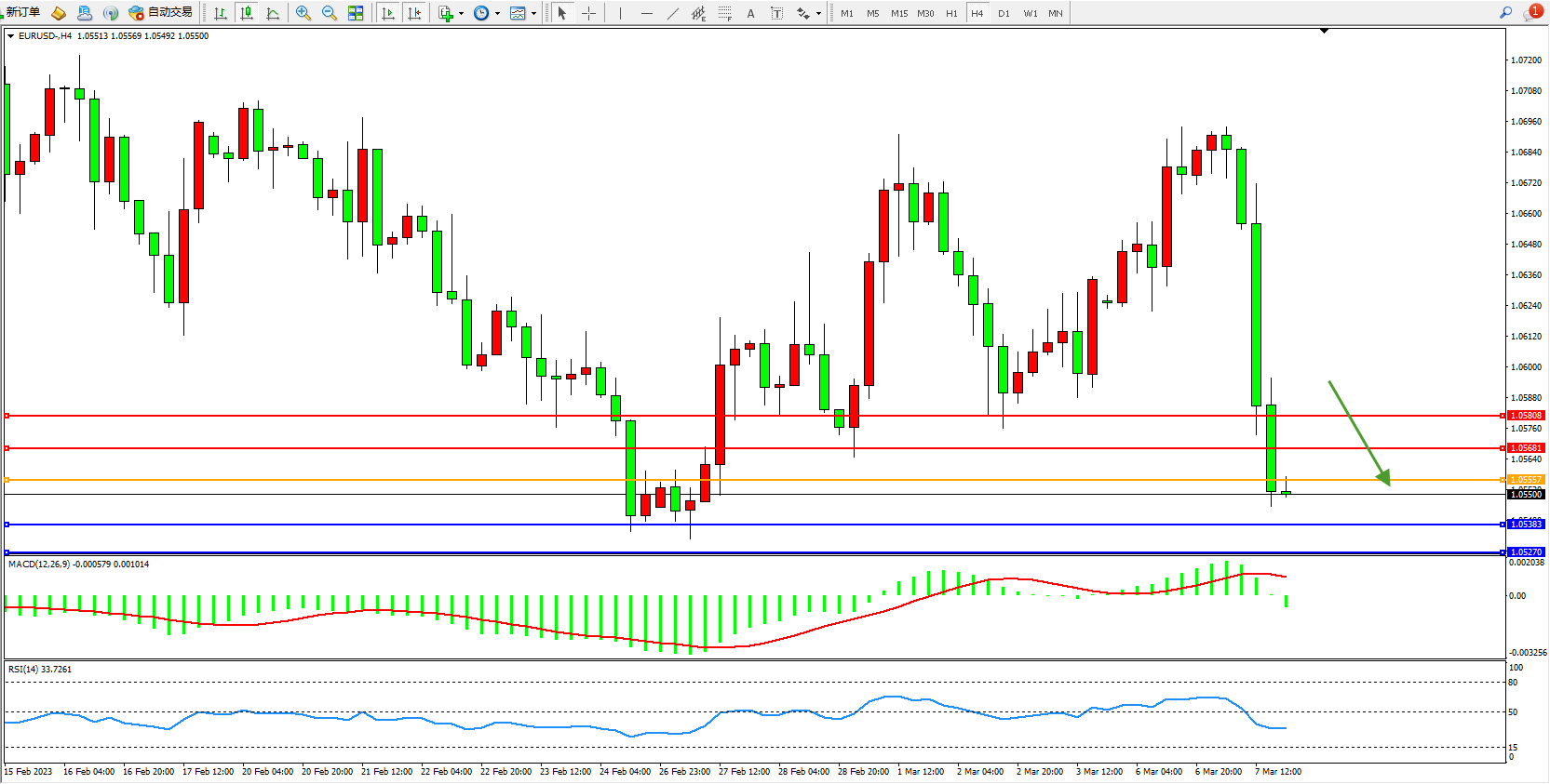 交易策略:1.05557下方看跌,目标1.05681  1.05808