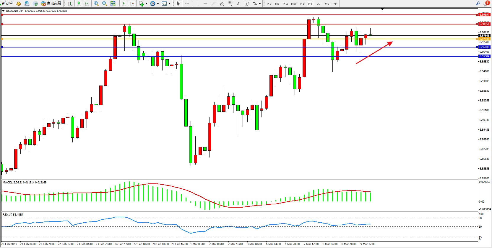 交易策略:6.97538上方看涨,目标6.98854 6.99697