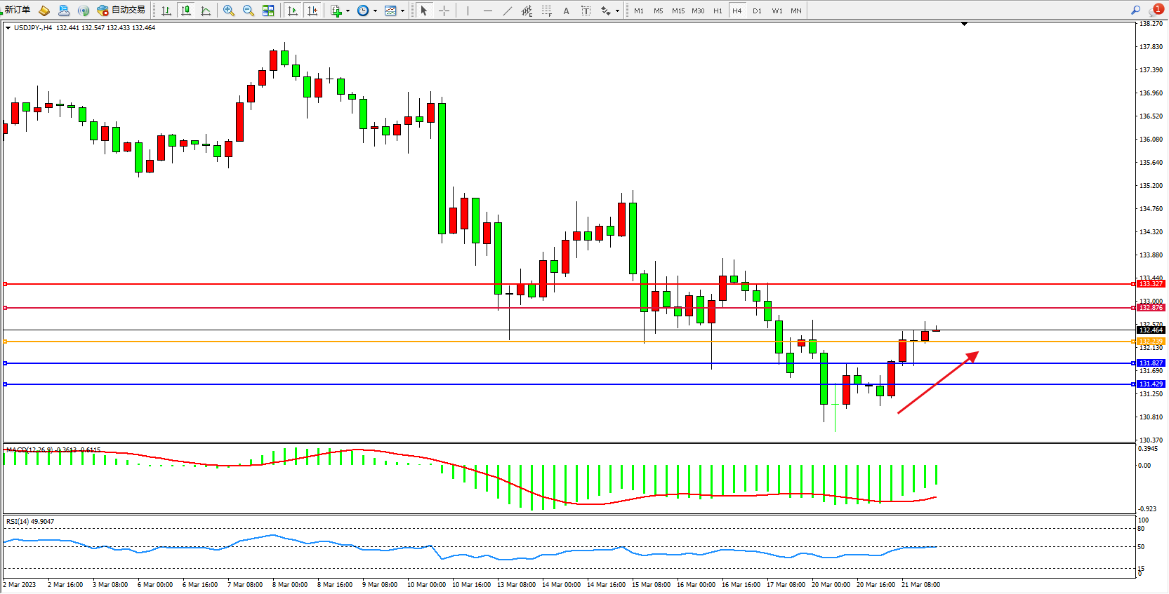 交易策略:132.239上方看涨,目标132.876  133.327