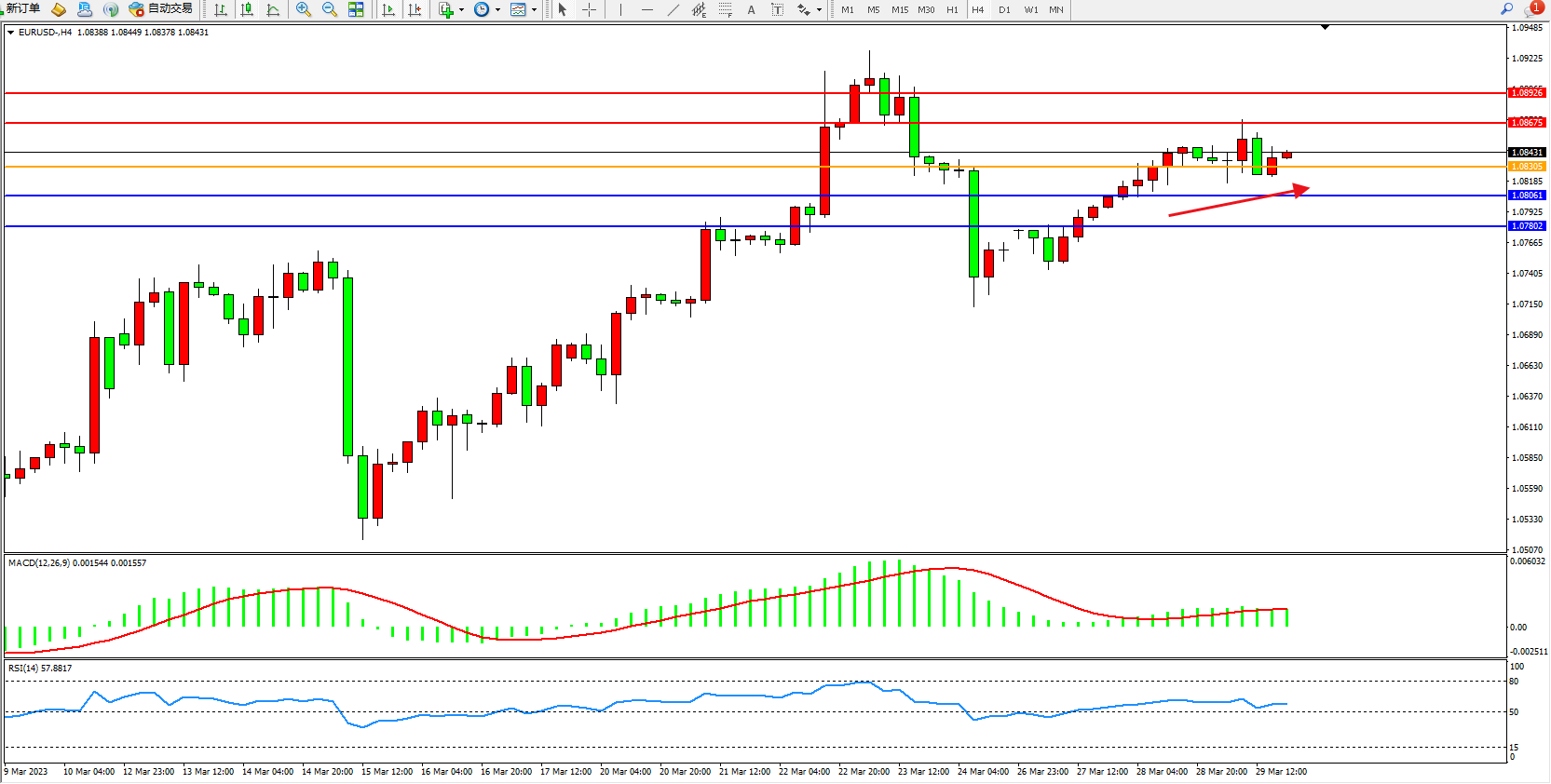 4小时图看:高位窄幅整理,市场多头情绪依旧,短期有继续震荡向上移动态势,MACD指标处于多头区域维持整理,RSI指标处于50均衡线上側弱势徘徊;