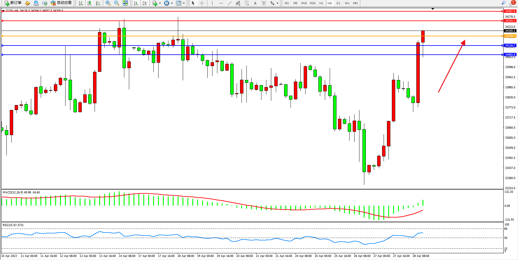 道琼斯指数DJ30——4小时K线图显示: