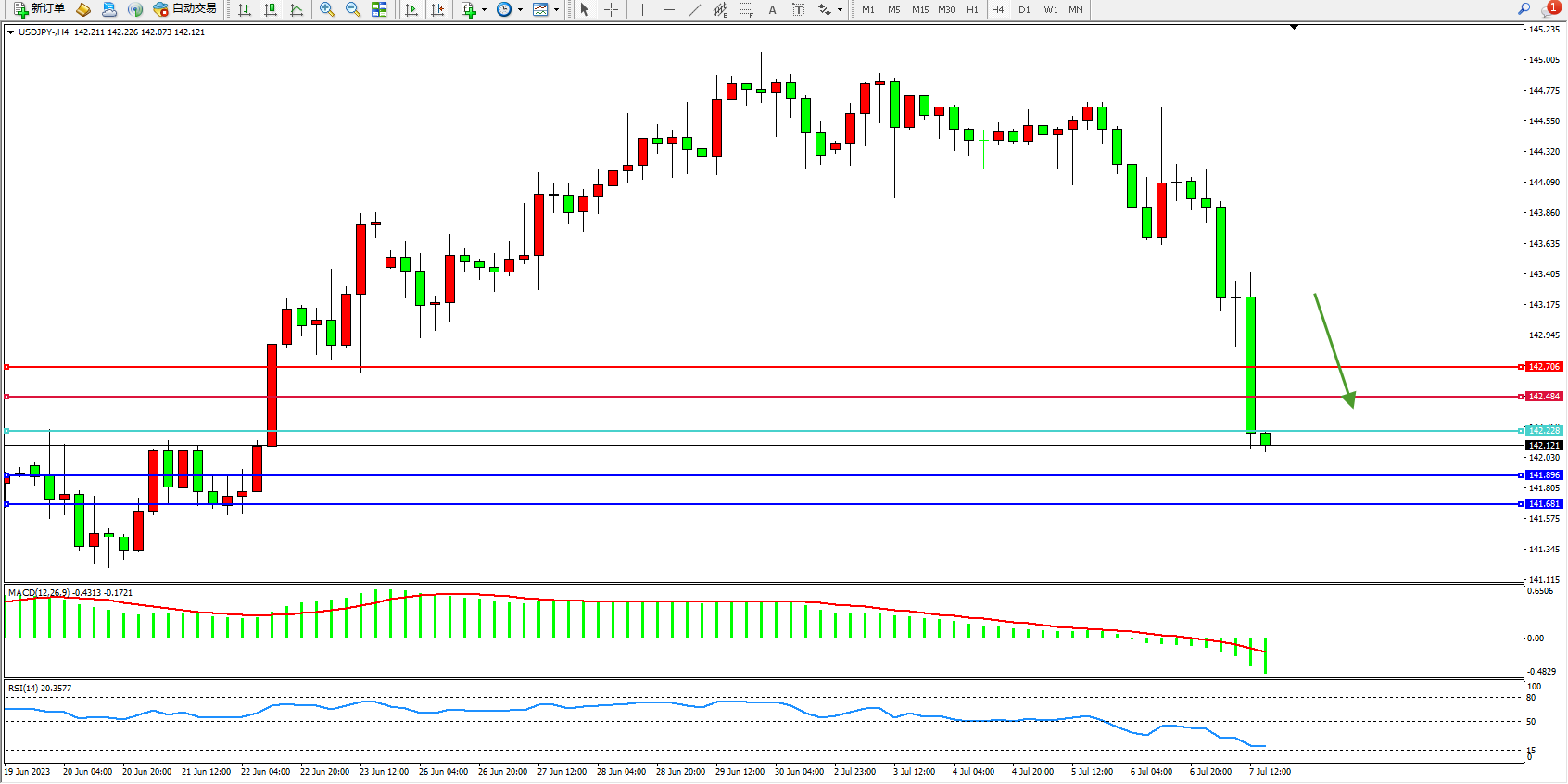 交易策略:142.228下方看跌,目标141.896 141.681