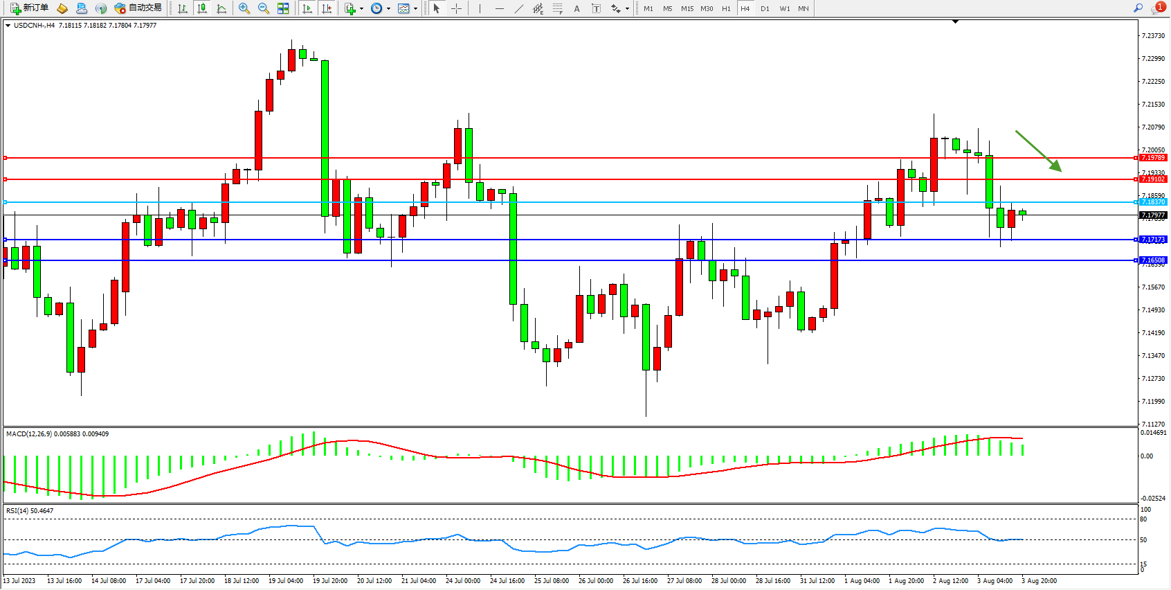 备选策略:7.18370上方看涨,目标7.19102 7.19789