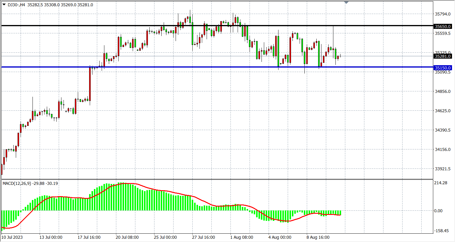 4小时图看,道指在35150附近受支撑反弹,在35650附近再度受阻回落,MACD在零轴下缩量,行情继续维持高位整理,支撑关注35150,阻力关注35650。