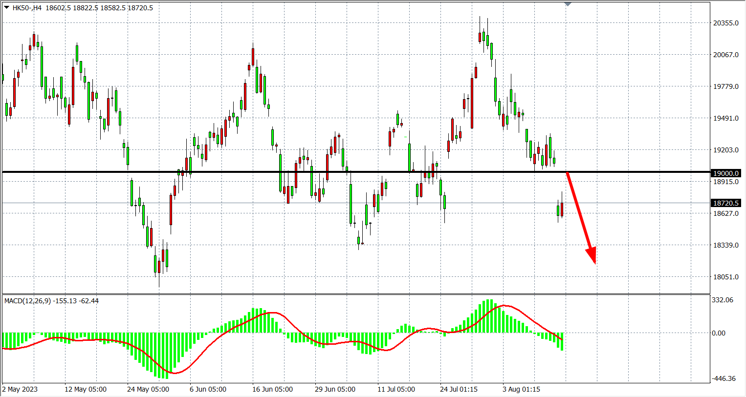 4小时图看,恒指跌破1900关口,MACD量能零轴下方加大,阻力继续关注19000,支撑关注18500-18300附近。
