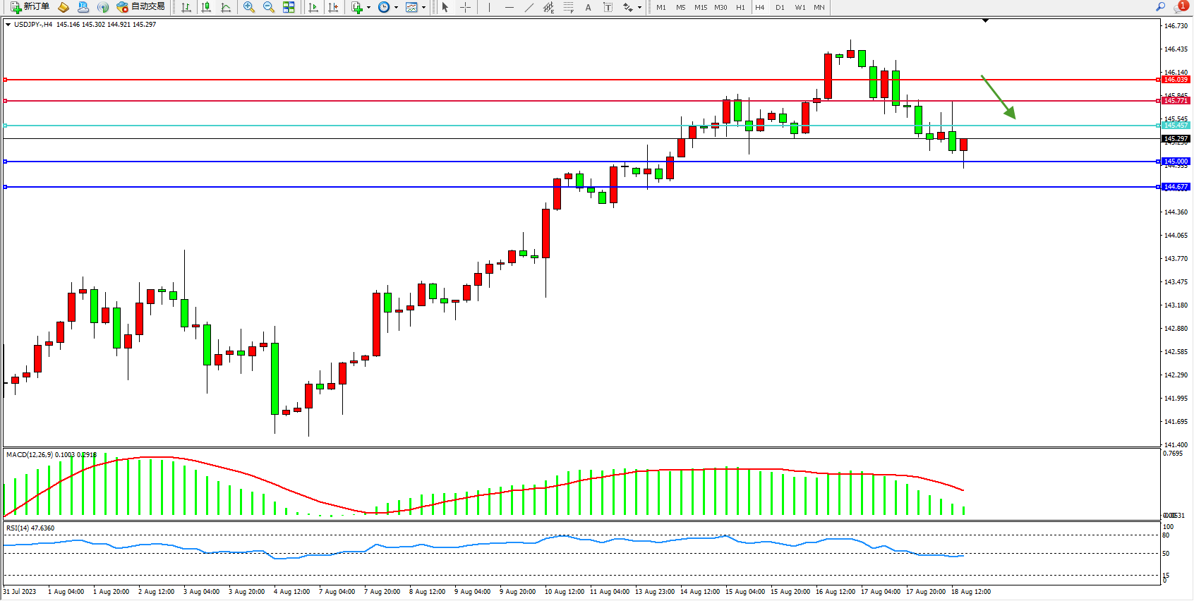交易策略:145.457下方看跌,目标145.000 144.677