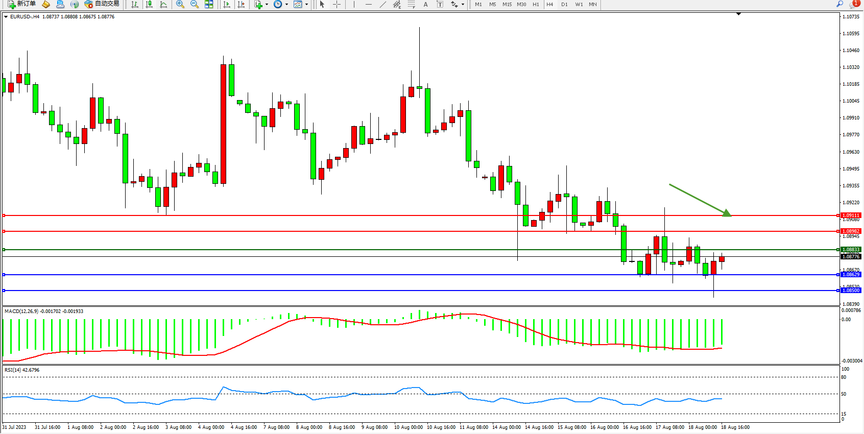 交易策略:1.08833下方看跌,目标1.08629 1.08500