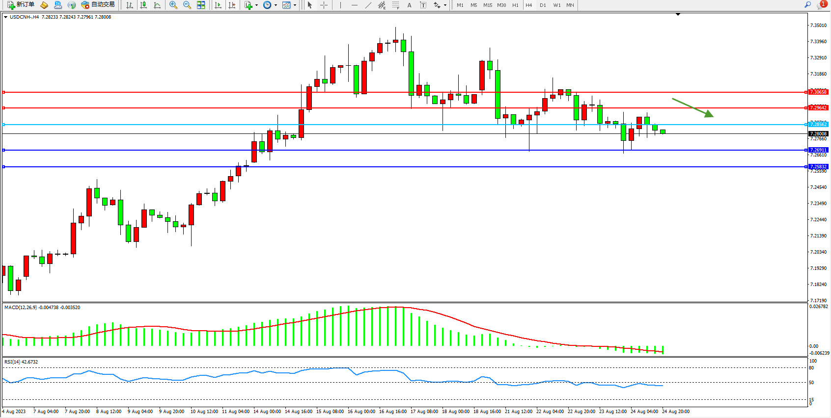 交易策略:7.28562下方看跌,目标7.26911  7.25832