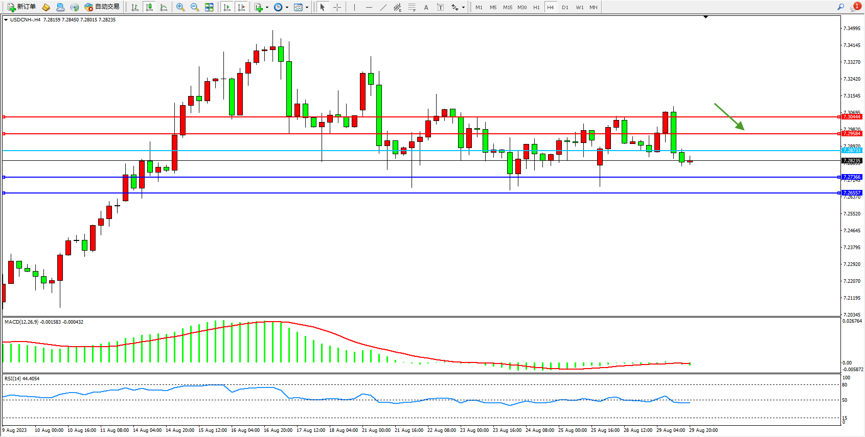 交易策略:7.28733下方看跌,目标7.27366  7.26557