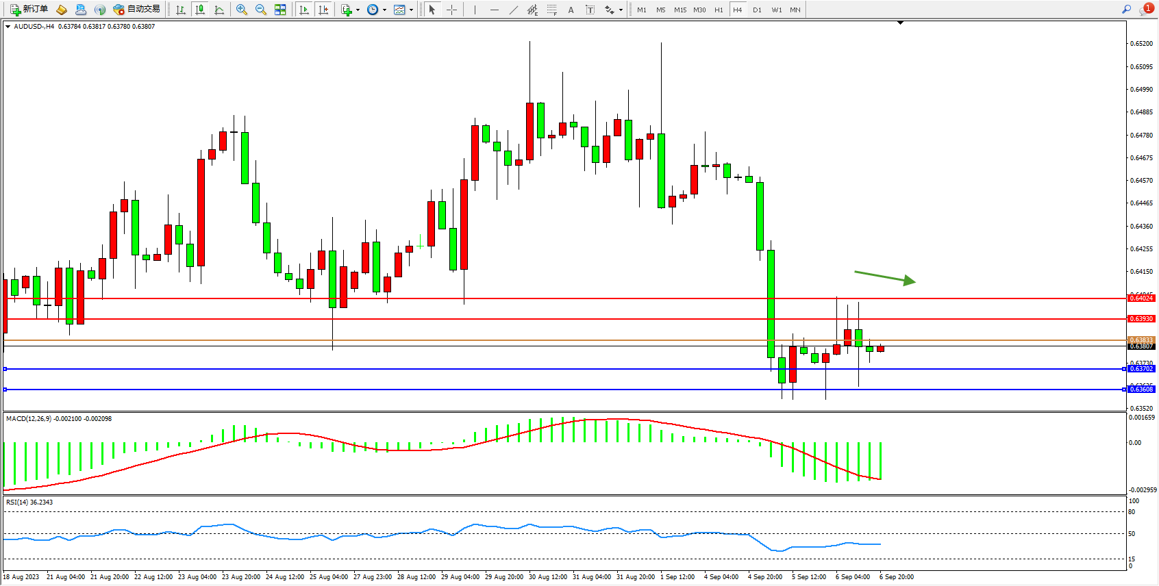 澳元美元AUDUSD——4小时K线图显示:
