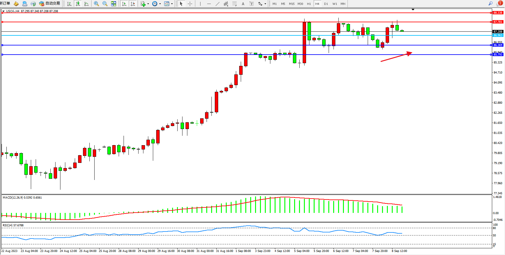 原油维持87.208附近震荡,随着OPEC+领导者延长减产至2023年底,油价在4年多以来最久的上涨之后,目前在近期高点附近休整。