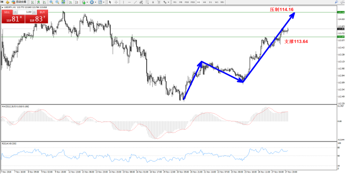 技术点评:  持续的多头节节攀升,有试图上攻前期高位的迹象,上方压制关注114.16附近,支撑关注113.64附近,MACD指标多头区域呈现长期稳定的上扬,RSI指标在多头区域有仰头上行态势;
