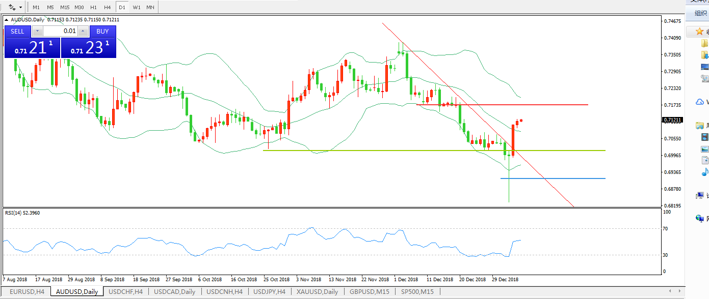 技术面简析:布林带开口开始拐头,价格升穿布林中轨,RSI拐头向上攻击,下降趋势线被击破,预计短期汇价将延续上行态势。