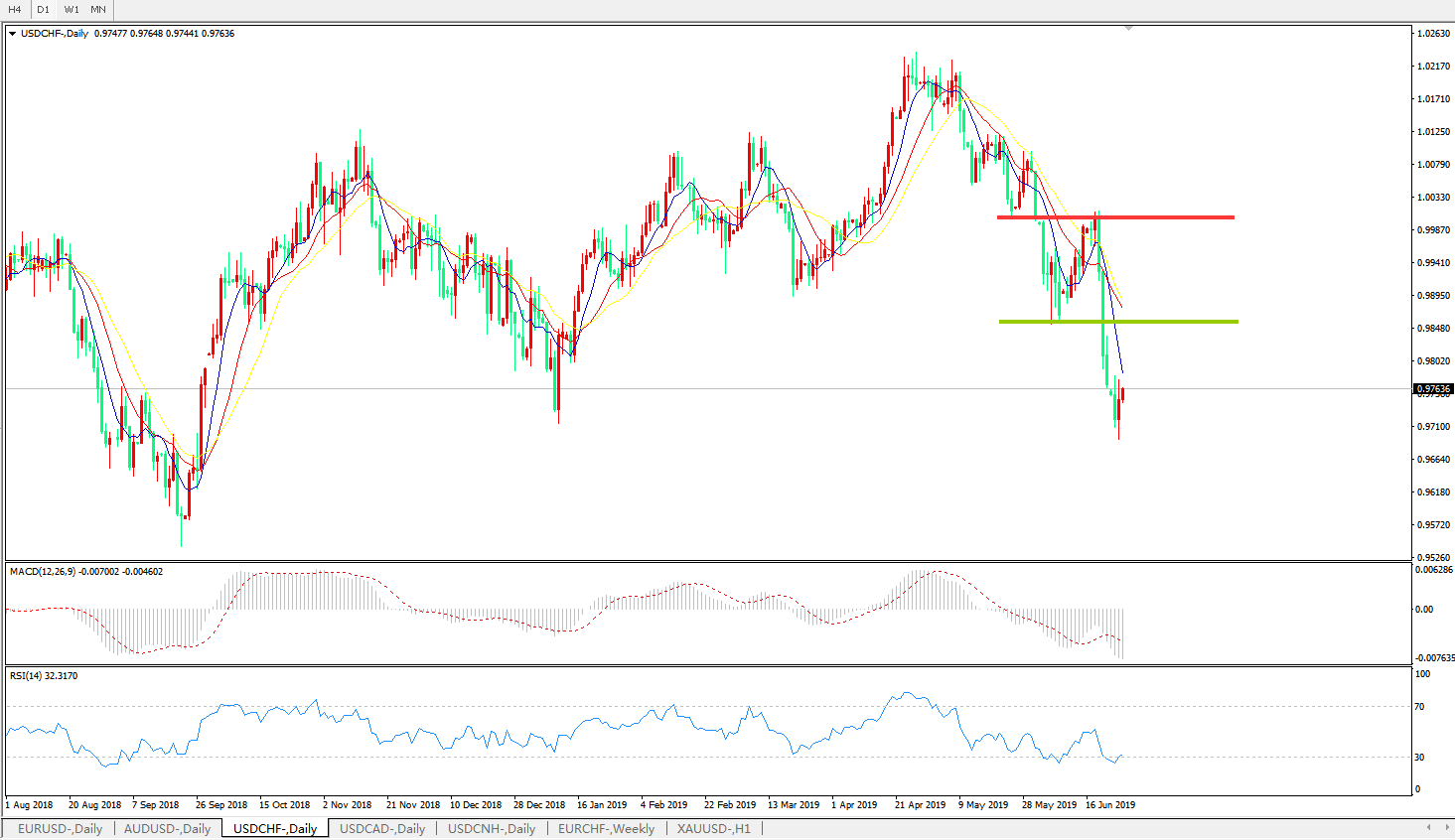 昨日公布的美国经济各项指数大都不及预期和前值,美国经济疲势继续。其中,美国6月谘商会消费者信心指数录得121.5,跌至20179月以来最低水平;美国5月新屋销售意外录得62.6万户,已是连续第二个月下滑。花旗首席外汇技术策略师Tom Fitzpatrick称,瑞郎兑美元和兑欧元涨势过度,应当解除美元兑瑞郎空头头寸。美元兑瑞郎上涨0.38%0.9757瑞郎,此前一度下跌0.3%20189月来最低,过去一周下跌超过2.5%;欧元兑瑞郎在日线图上连续第三天呈现多头背离。