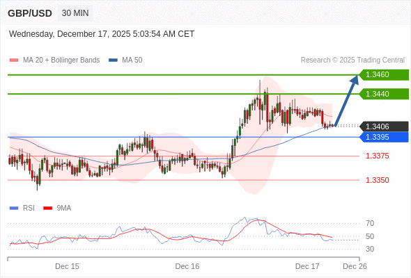 在 1.3395 之上,看涨,目标价位为 1.3440 ,然后为 1.3460 。