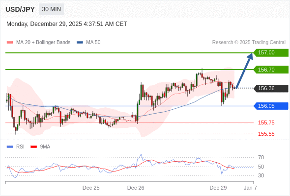 在 156.05 之上,看涨,目标价位为 156.70 ,然后为 157.00 。