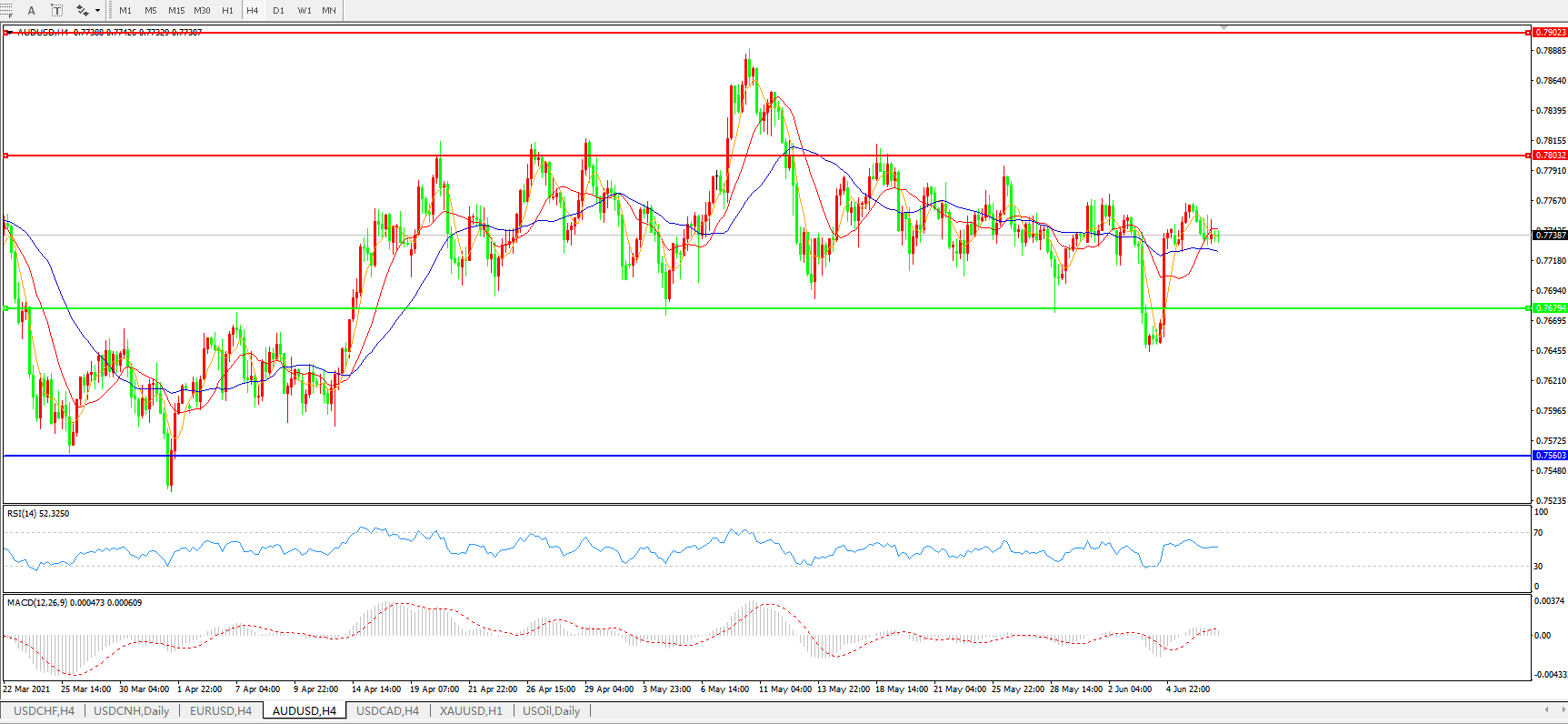 技术面简析:4小时图均线再度粘合无方向,汇价偏强整理,MACD运行于0轴附近且量能若隐若现,RSI偏中性,预计汇价大概率将进一步震荡整理。