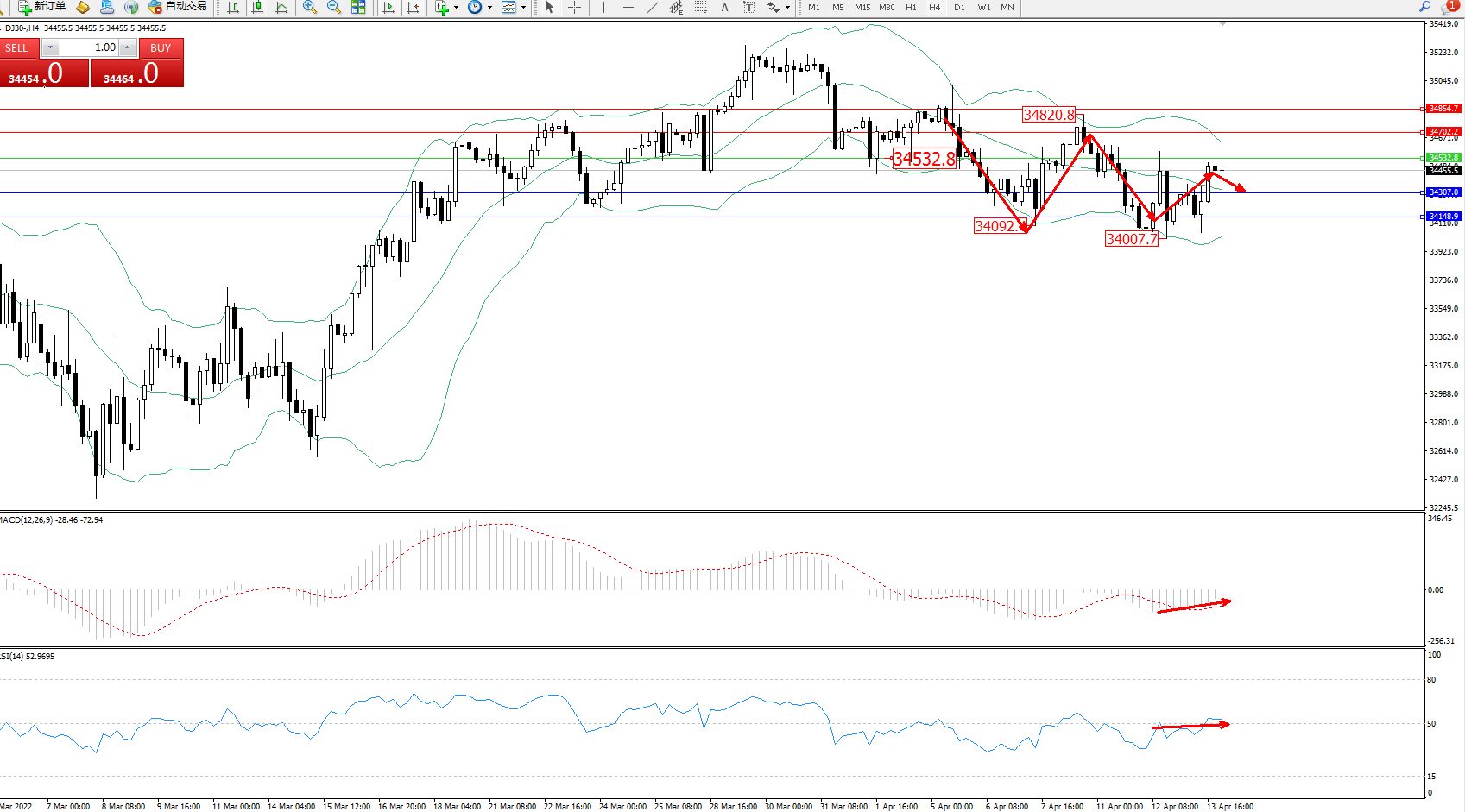 交易策略:34532下方看跌,目标34307、34148