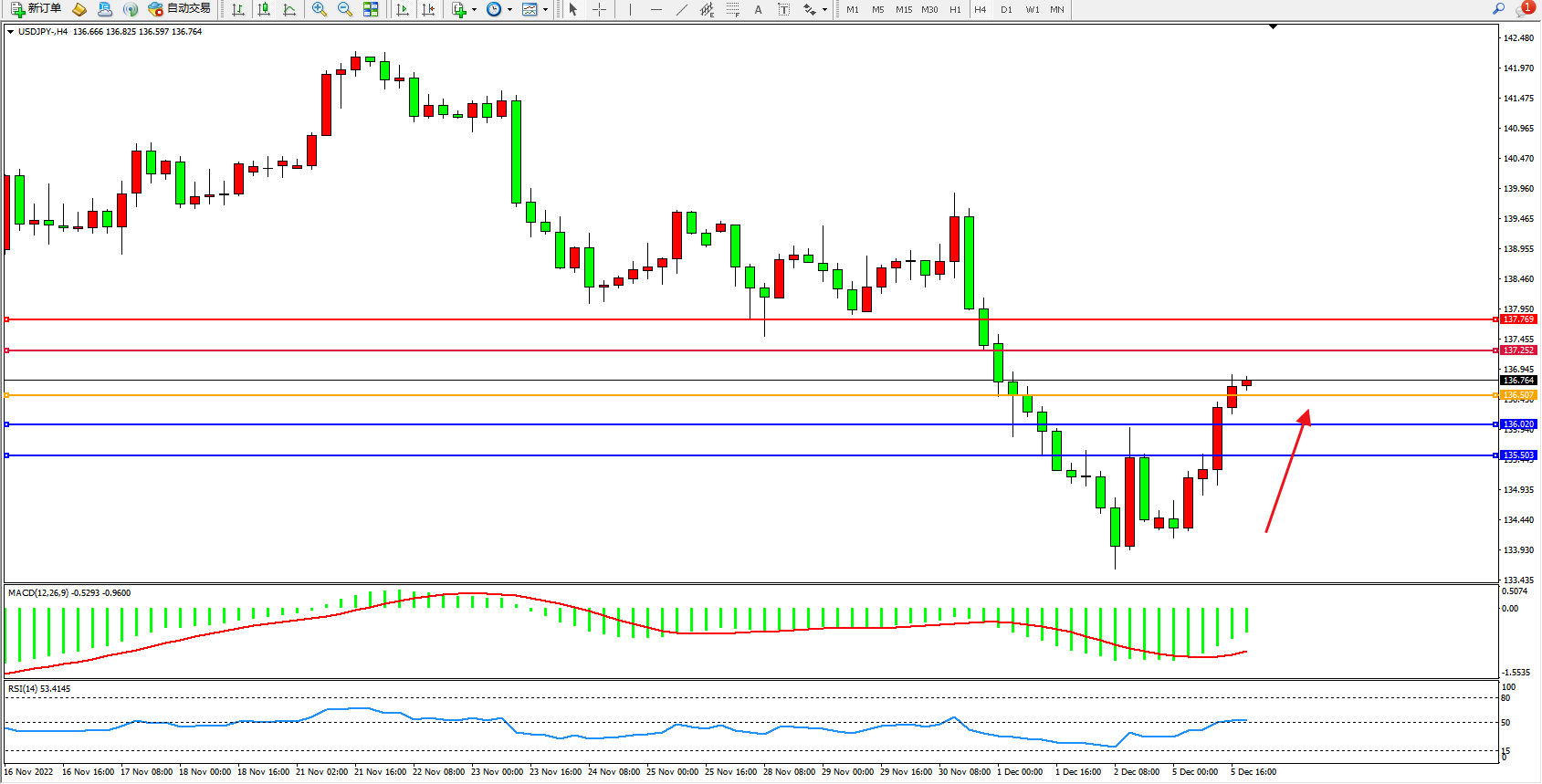 交易策略:136.507上方看涨,目标137.252、137.769